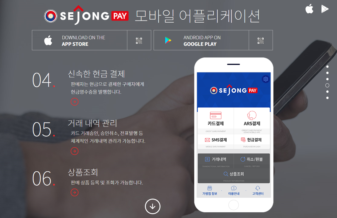 간편결제서비스 세종페이의 경우 카드결제가 아닌 현금결제에서도 현금영수증 발행도 가능하고, 카드 거래 승인이나 취소 및 전표발행등 체계적인 거래내역 관리도 가능합니다. 여기에 판매 상품 등록과 조회도 가능해 결제부터 상품관리까지 한번에 처리가능한 점도 장점입니다.