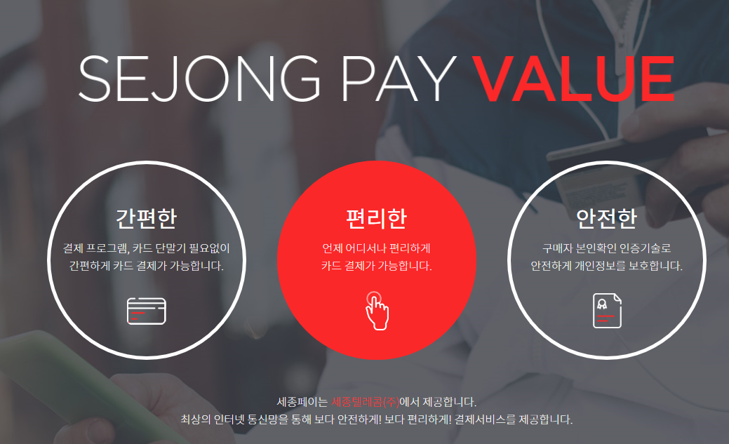 세종페이의 경우 판매자와 구매자 모두의 편의를 위하면서 안전하게 결제할 수 있도록 구성된 점이 특징입니다. 별도의 카드 단말기나 결제 프로그램이 없어도 고객분들이 간편하게 카드결제를 할 수 있는 서비스로 구매자는 물론 판매자도 만족스러운 결제를 진행할 수 있도록 도와주고 있습니다.