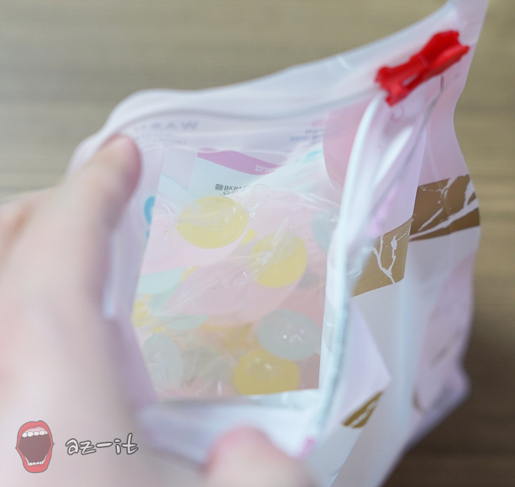 젤리형태의 구슬 모양 내용물 때문에 자칫 아이들이 장난감으로 오인 가지고 놀 수 있는 상황을 미연에 방지하기 위해서 이중 잠금지퍼 파우치 구조로 구성되어 있습니다. 혹시 모를 상황을 미연에 방지할 수 있도록 신경쓴 부분들도 돋보이는 부분입니다.