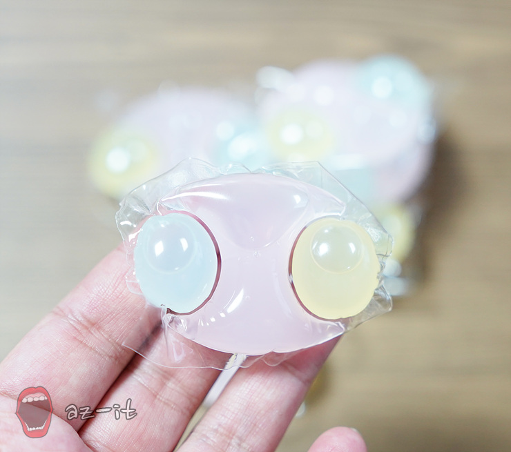 내용물을 살펴보면 캡슐세제 이름 처럼 동글동글한 파스텔톤의 세제가 각각의 공간에 들어 있는 모습을 확인할 수 있습니다. 내용물을 보면 고농축 세제 6배를 한알에 넣어두어 세정력을 높여 세제 용량에 대한 고민을 하지 않아도 될 정도 입니다. 뿐만 니라 섬유케어하는 효소를 넣어 섬유유연제효과까지 넣어 세제와 섬유유연제 따로따로 고민하지 않아도 될 정도입니다.
