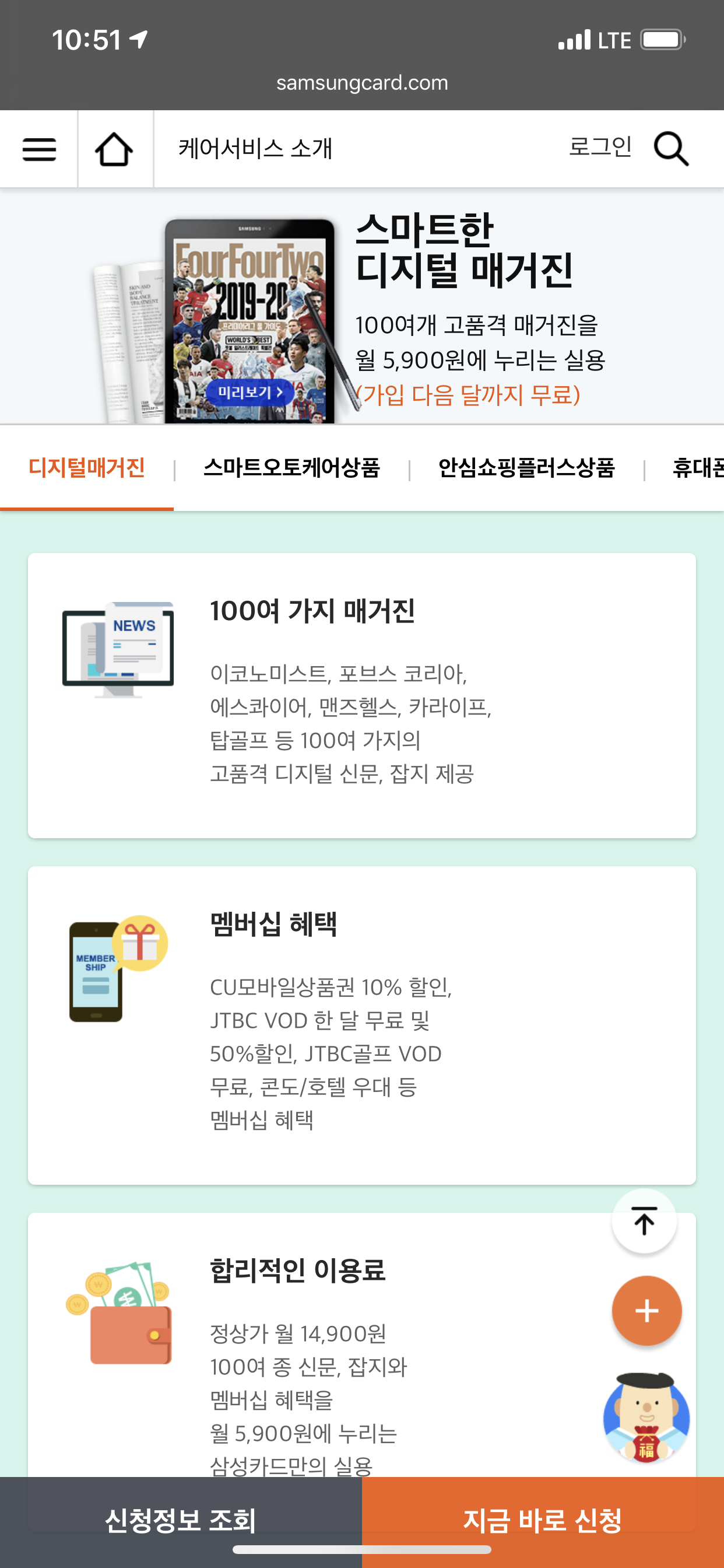 삼성카드에서 제공하는 케어서비스의 일환으로 신청 가능한 디지털매거진의 경우 맨즈헬스를 비롯한 이코노미스트, 포스스코리아, 에스콰이어등 100여가지에 이르는 디지털 신문과 잡지로 구성되어 있고, 멤버십 혜택을 통해 CU 모바일상품권10% 할인부터 JTBC VOD 한달 무료 및 50% 할인등 다양한 멤버십 혜택까지 받아볼 수 있다는 점입니다.