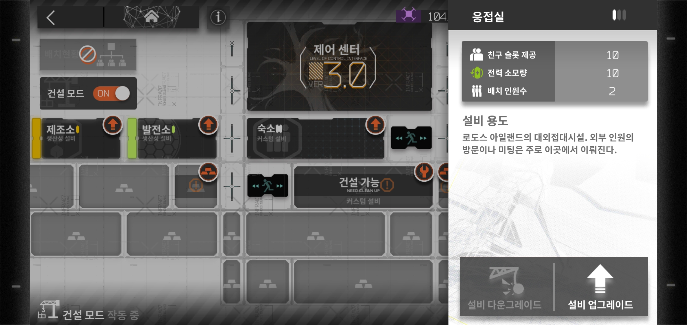 각 기반시설을 업그레이드 하기 위해선 왼쪽 상단 건설모드를 ON으로 놓아주어야만 진행 가능합니다. 제어센터를 기반으로 업그레이드 할 수 있는데다, 그에 필요한 아이템 제작도 가능하기 떄문에 제어센터를 1순위로 업그레이드 해주는 일은 기본이 된다고 할 수 있습니다.
