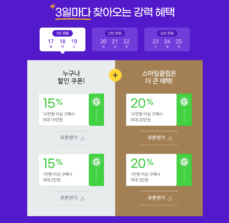 G마켓 가전세일 기간동안 받을 쿠폰들은 1차, 2차, 3차 로 구성되어 있습니다. 쿠폰 구성을 보면 누구나 할인쿠폰을 포함해 스마일클럽 회원시 추가 쿠폰을 받아 보다 할인된 비용으로 필요한 물건 구매가 가능합니다. 3일마다 한번씩 총 3번의 할인쿠폰이 주어지는 점도 잘 활용하면 스마일클럽 가입비는 채워 넣고도 남을 정도입니다.
