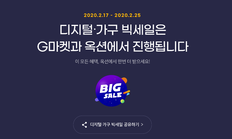 2월 25일까지 진행되는 디지털, 가구 빅세일은 G마켓과 옥션에서 동시에 진행됩니다. 필요한 제품이 많아 어떤 제품을 할인혜택 받으면 좋을지 고민되시는 분들이라면 두곳을 함께 활용해 구매하시는 것도 한 방법이 아닐까 싶군요.