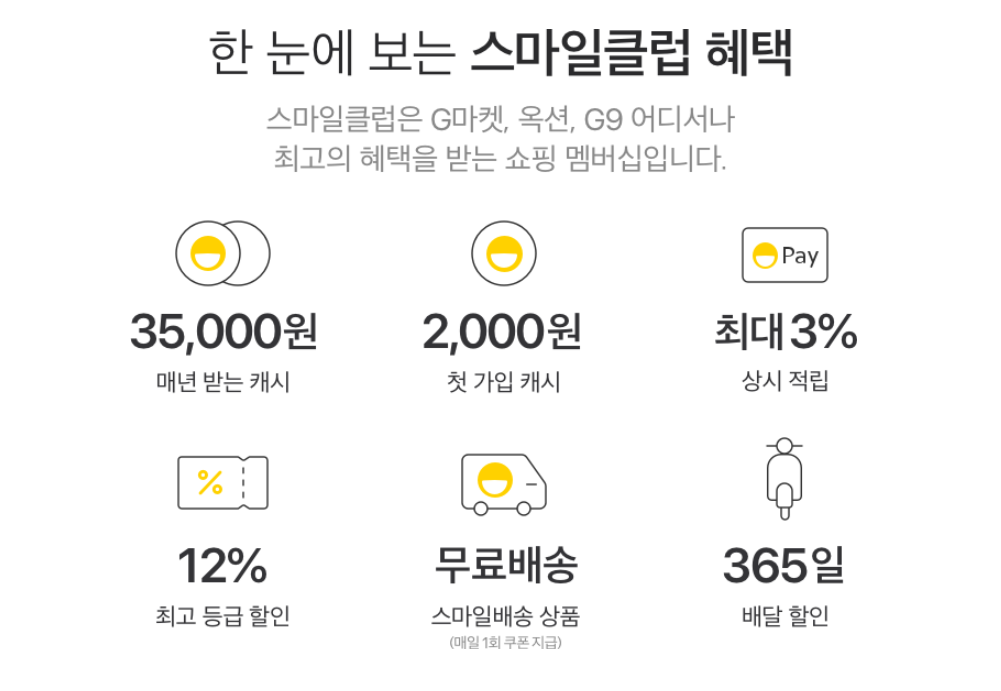 더 많은 혜택을 받을 수 있는 스마일클럽의 경우 이번 세일뿐만 아니라 평소에도 많은 할인부터 혜택까지 받을 수 있는 서비스입니다. 매년 받을 수 있는 캐시부터 첫 가입캐시 등 멤버십에 가입되면 받을 수 있는 G마켓에서 받는 혜택이 기하급수 적으로 늘어난다고 할까요?