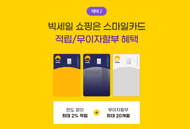 스마일클럽외에 스마일카드가 있다면 적립과 무이자 할부혜택도 주어집니다. 구매 비용 한도 없이 최대 2% 적립이 가능하고, 최대 20개월 무이자 할부가 가능해 G마켓에서 필요한 물건 구입시 보다 유용한 혜택들을 받을 수 있습니다.