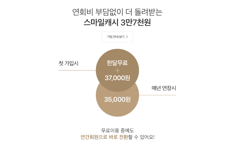처음 가입시 들어가는 연회비 3만원이 있으나 35,000 캐시를 받아 사용할 수 있는데요, 첫 가입시에는 37,000캐시를 돌려받아 현금처럼 사용하면 되기 때문에 가입비에 대한 부담은 없다고 봐도 될 정도 입니다.