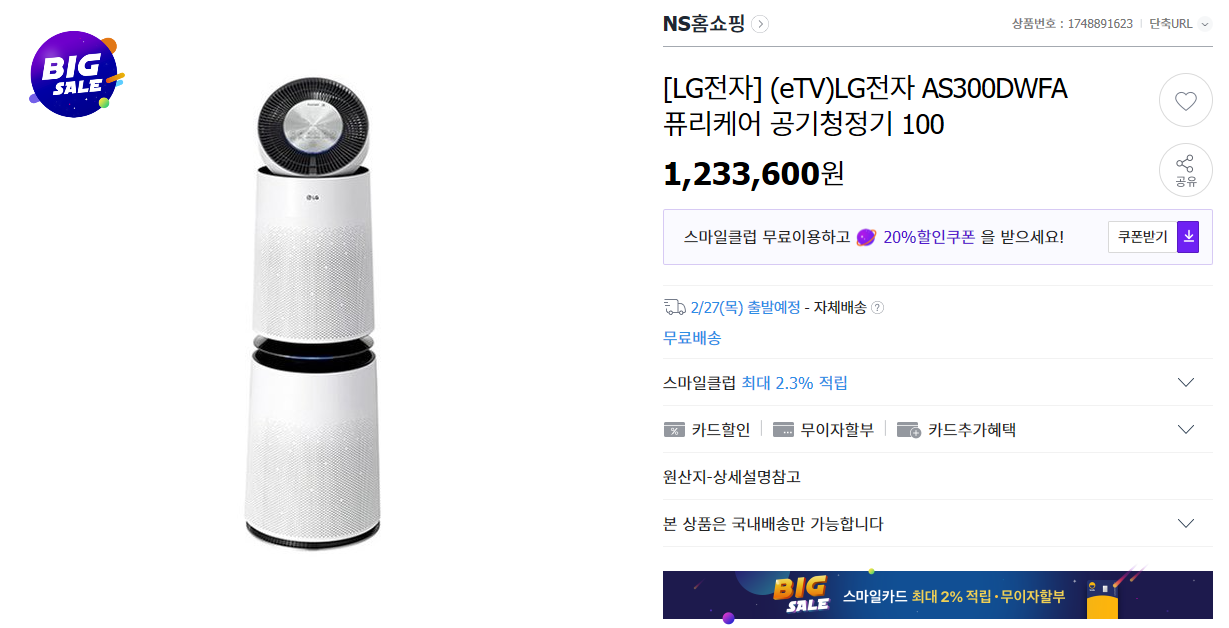 이사를 준비하면서 여러 가장 먼저 구매를 결정한 제품은 LG전자 공기청정기 입니다. 아무래도 공간이 넓어져 현재 가지고 있는 공기청정기만으로는 실내 공기를 커버하기 어려운 부분이 있기 때문인데요, 할인쿠폰까지 받아 구매를 하면 실제 구매하는 비용은 더욱 낮아져 지금이 기회가 아닐까 싶습니다.