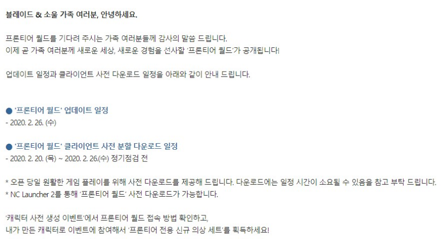 프론티어 월드 업데이트에 대한 일정도 공개되었습니다. 2월 26일 수요일 업데이트가 진행된다고하는데요, 미리 사전 분할 다운로드가 가능한 만큼 오픈 당일 원활한 플레이를 즐기고 싶다면 미리 사전 다운로드를 받는 것도 중요합니다. 특히 사전 캐릭터 생성을 안한 분들이라면 조금이라도 시간이 남은 지금 서둘러 참여하고 프론티어 전용 신규 의상 세트를 획득하는 것도 잊지마시구요!