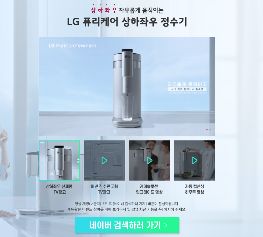 깨끗한 물을 마실 수 있는 기능은 기본 편리함까지 더한 LG 퓨리케어 정수기와 함꼐 하는 행운 검색 이벤트는 행운검색 이벤트 페이지 준비되어 있는 영상을 재생하면 3초 후 네이버 검색하러 가기 버튼이 활성화 됩니다. 이때 버튼을 클릭하면 네이버 화면으로 이동하여 행운의 검색어를 검색창에 검색하면 됩니다