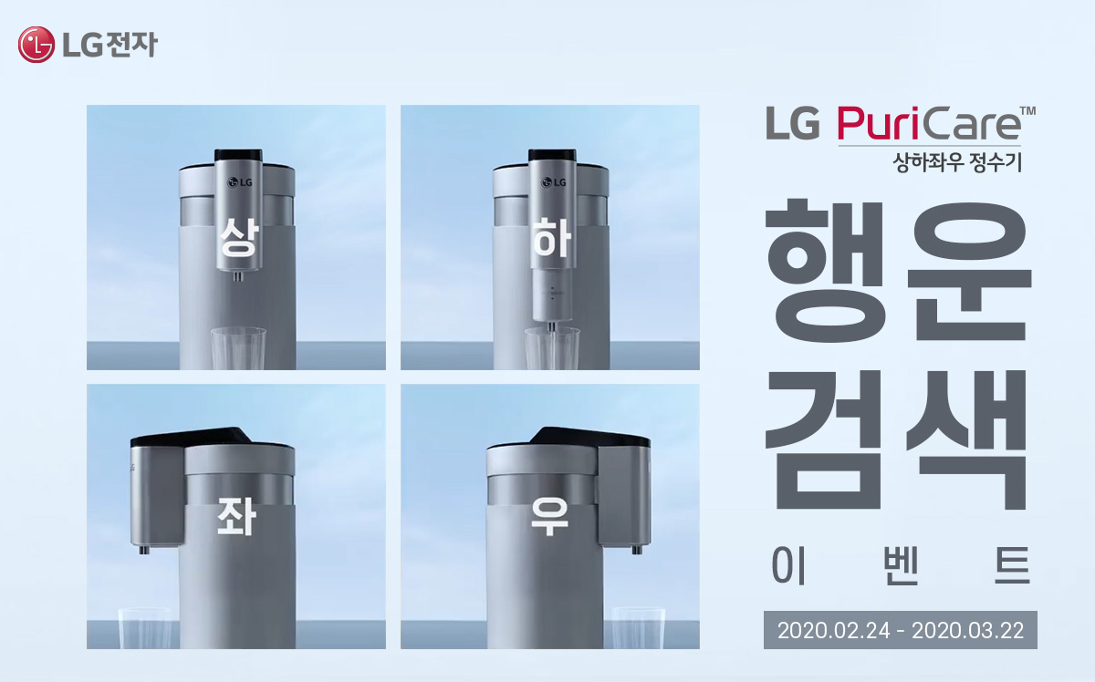 LG전자에서 만나 볼 수 있는 LG전자 퓨리케어 상하좌우 정수기 행운이벤트가 시작되었습니다. 2월 24일부터 시작해 3월 22일까지 진행되는 이번 이벤트는 별도의 어려움 없이 검색만 해도 참여 가능한데요, 매일 1명에게 LG 퓨리케어 미니 공기청정기를 비롯해 풍성한 선물이 주어진다고 합니다.