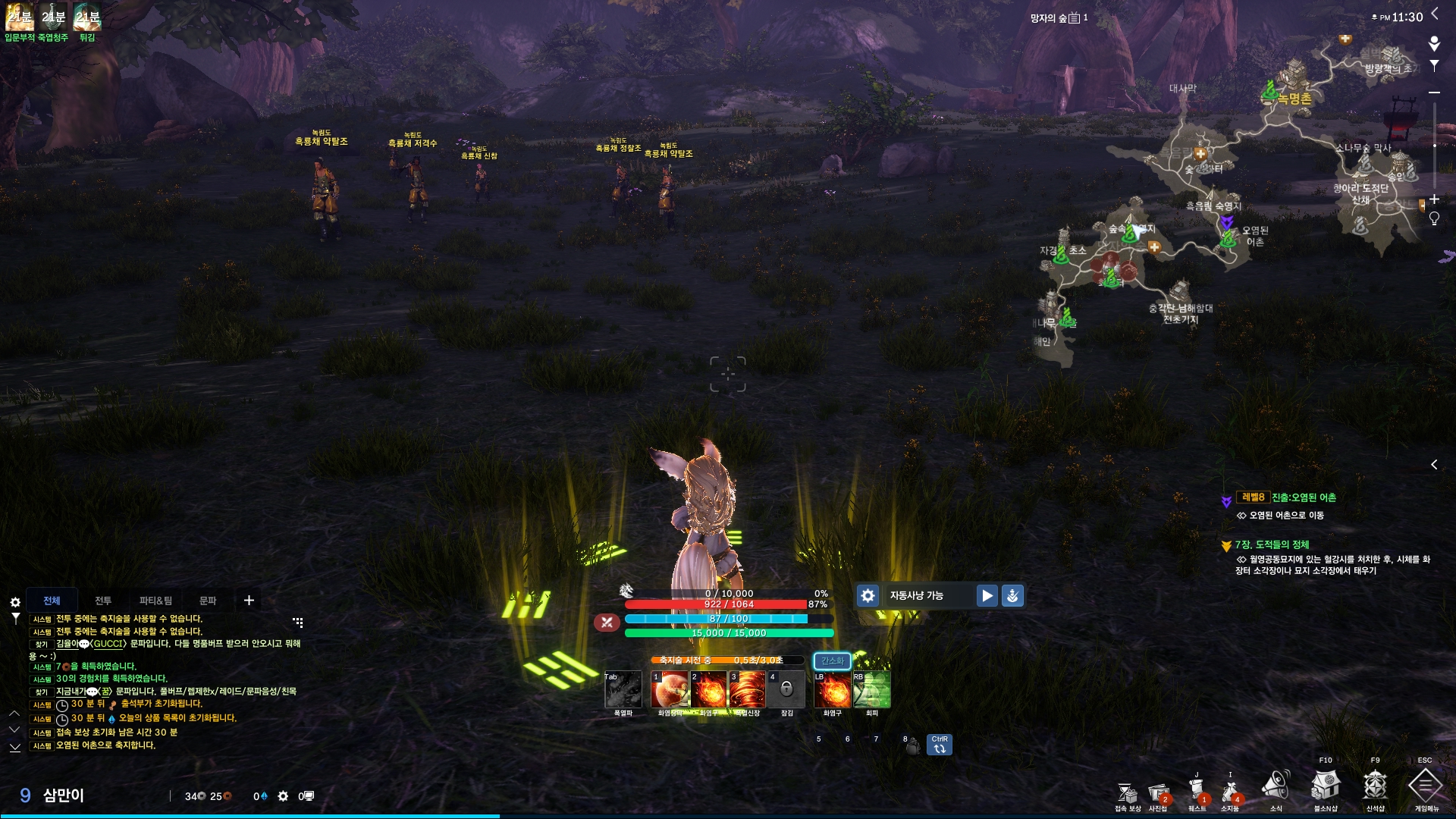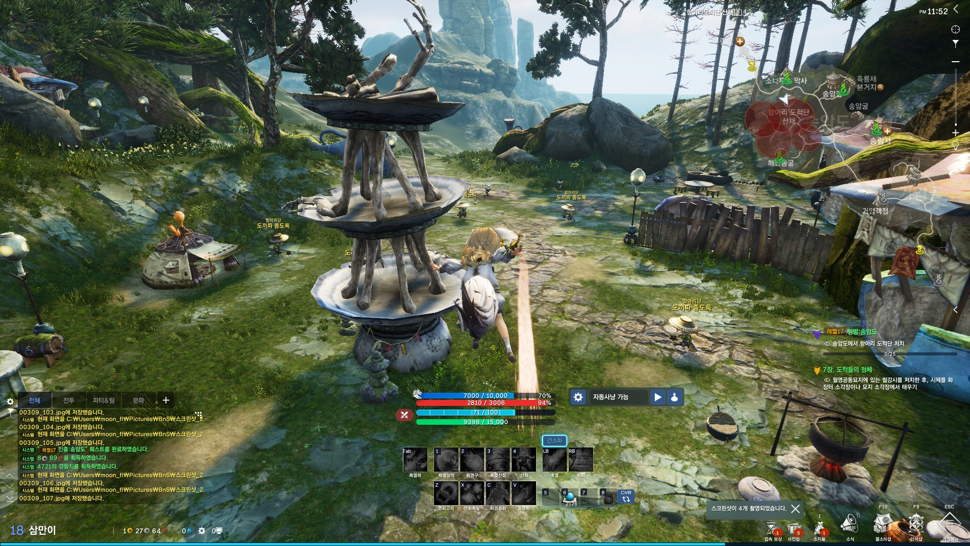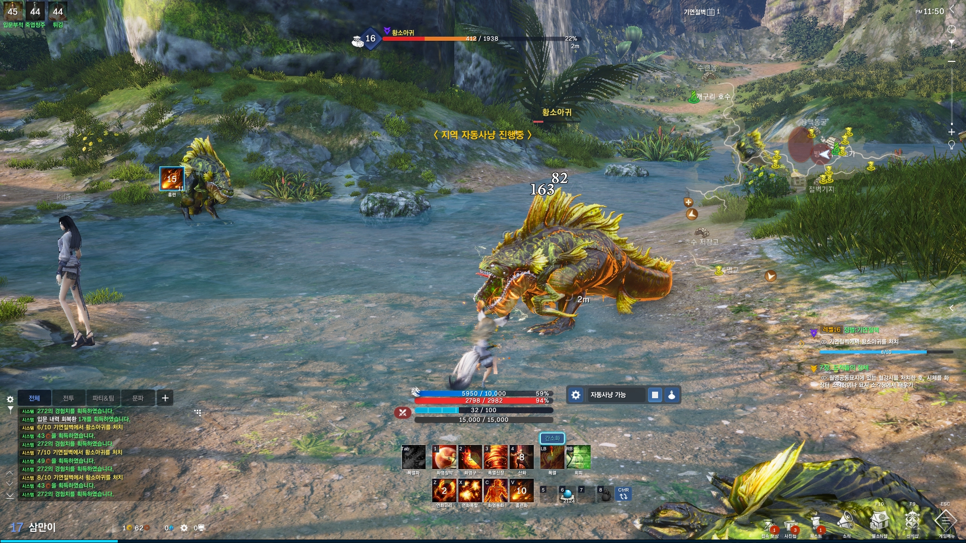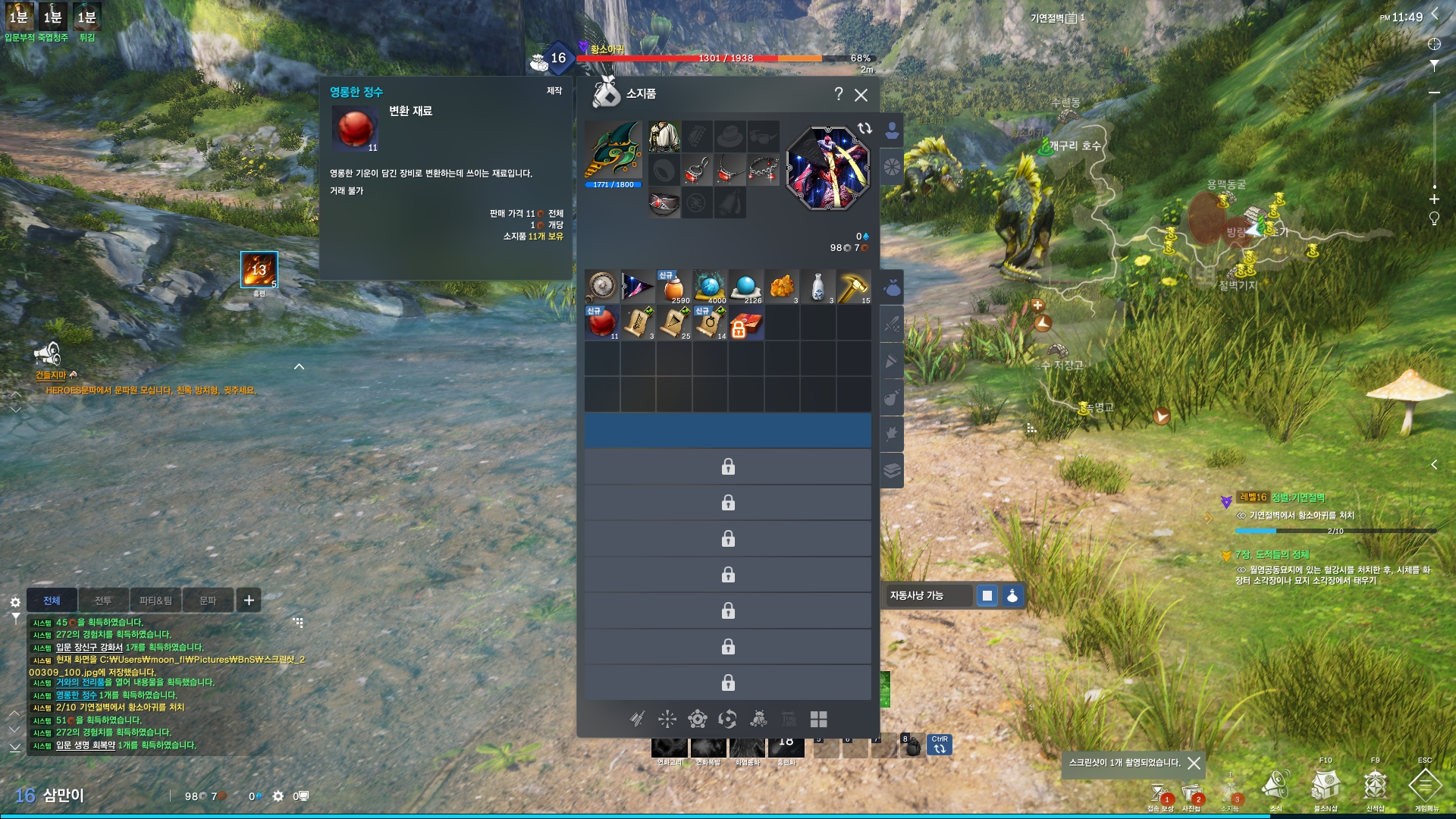 초보자의 경우 캐릭터의 스킬 연계기를 맞춰 사용하는 일이 어려울 수도 있는데요, 자동사냥을 선택하면 알아서 초식을 맞춰 사냥을 진행하니 몹 잡는 속도도 확실히 다르더군요. 여기에 그래픽의 향상으로 전투시 보여지는 그래픽은 두말할 필요가 없을 정도였습니다.