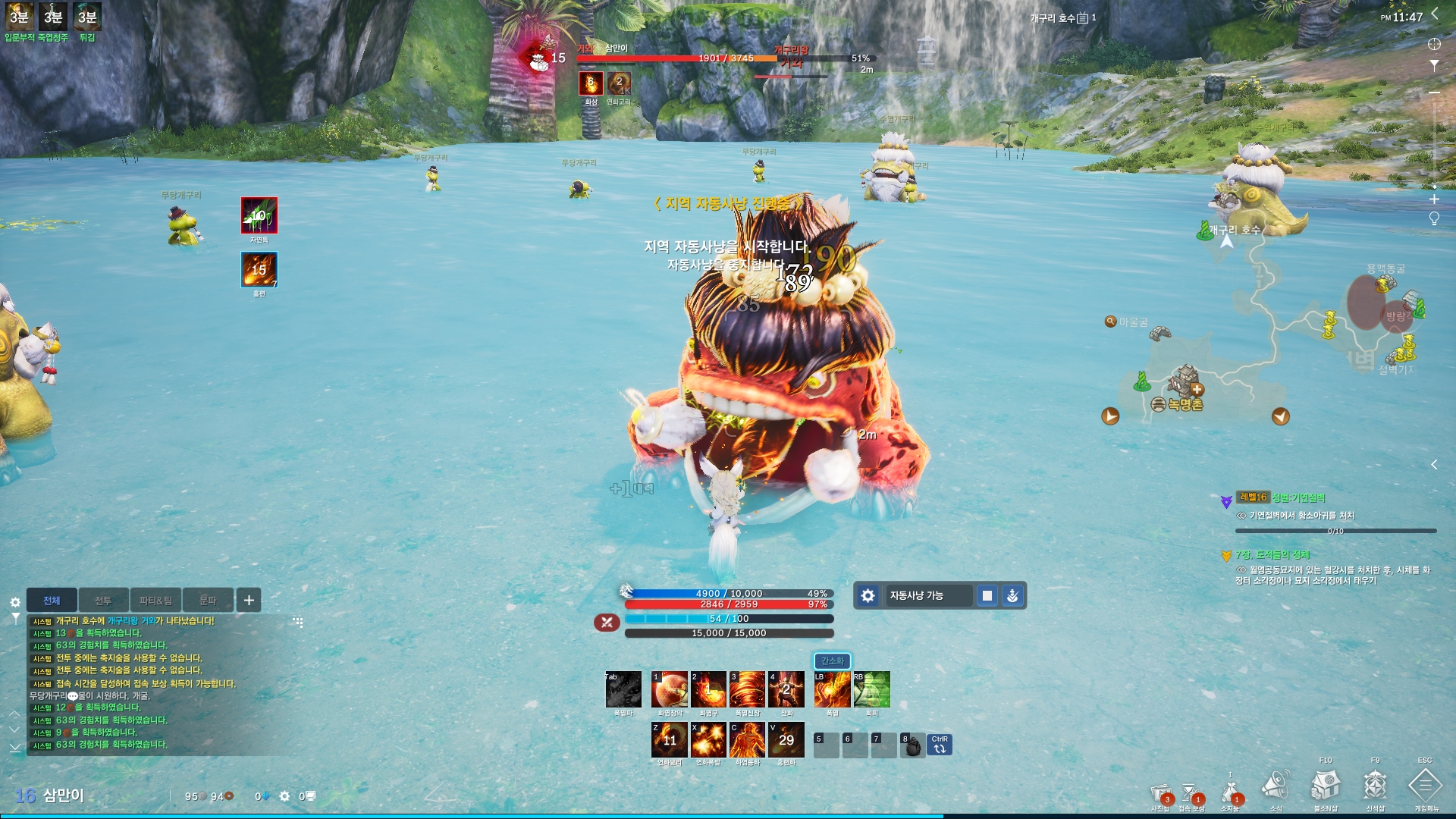 프론티어월드의 경우 라이브서버와 달리 많은 것들이 달라진 점도 눈에 띄었습니다. 플레이를 즐기는데 있어 보다 유저들 중심의 편리한 방식인데요, 필드에서는 자동사냥 기능을 자유롭게 사용할 수 있었습니다. 무엇보다 내력을 사용하는 스킬의 경우에도 자동으로 사용이 가능하며, 내력과 체력이 떨어지면 물약을 사용하는 점도 편리했습니다.