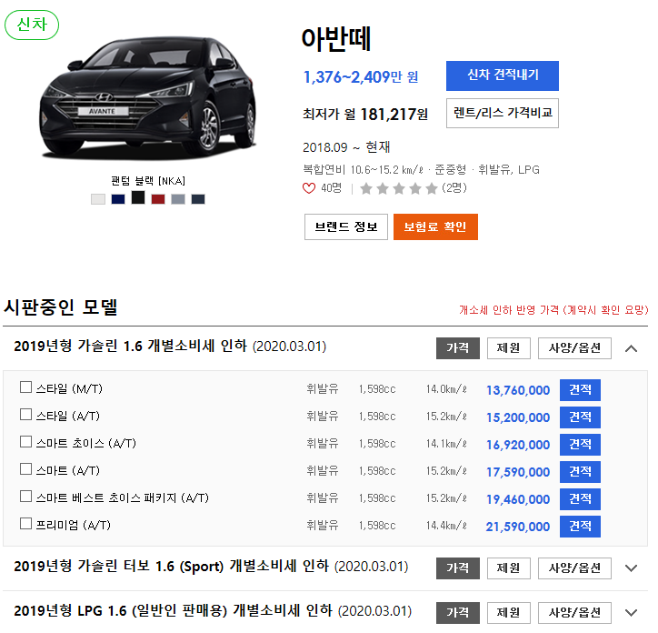 막상 캐시백으로 돌려 받는 비용이 차량 가격의 1.5%라고 하니 그리 커 보이지 않을 수도 있는데요, 계산을 해보면 확실히 돌려 받는 금액이 상당하다는걸 알 수 있습니다. 어떤 모델이든 상관없는데요, 아반떼 2019년형 가솔린 1.6 프리미엄 모델로 계산을 해보았습니다.