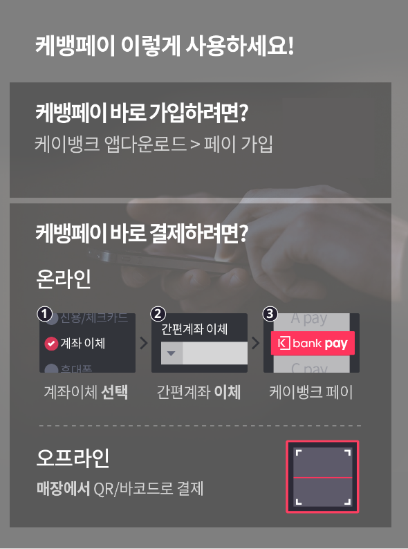 케이뱅크페이 사용의 경우 케이뱅크 앱을 다운로드 받은후 계좌를 개설한 다음 페이에 가입하면 되는데요, 온라인 결제의 경우 계좌이체 선택후 간편계좌 이체를 선택한 다음 케이뱅크페이를 설정해 주면 완료됩니다. 오프라인 매장에서는 QR코드 및 바코드 결제로 보다 간편한 결제를 할 수 있어 편리합니다.