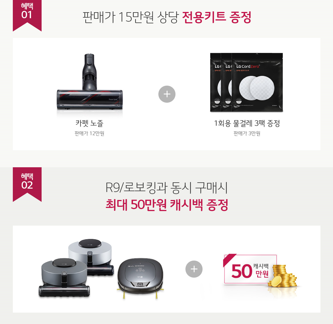 무선청소기 2020 NEW LG 코드제로 A9S ThinQ 사전예약판매를 통해 구매할 경우 주어지는 혜택도 상당합니다. 우선 15만원 상당의 카펫 노줄과 1회용 물걸레 3팩을 사전예약판매에 참여하는 모든 분에게 주어지고, R9/로보킹과 동시에 구매할 경우 최대 50만원 캐시백이 증정됩니다.