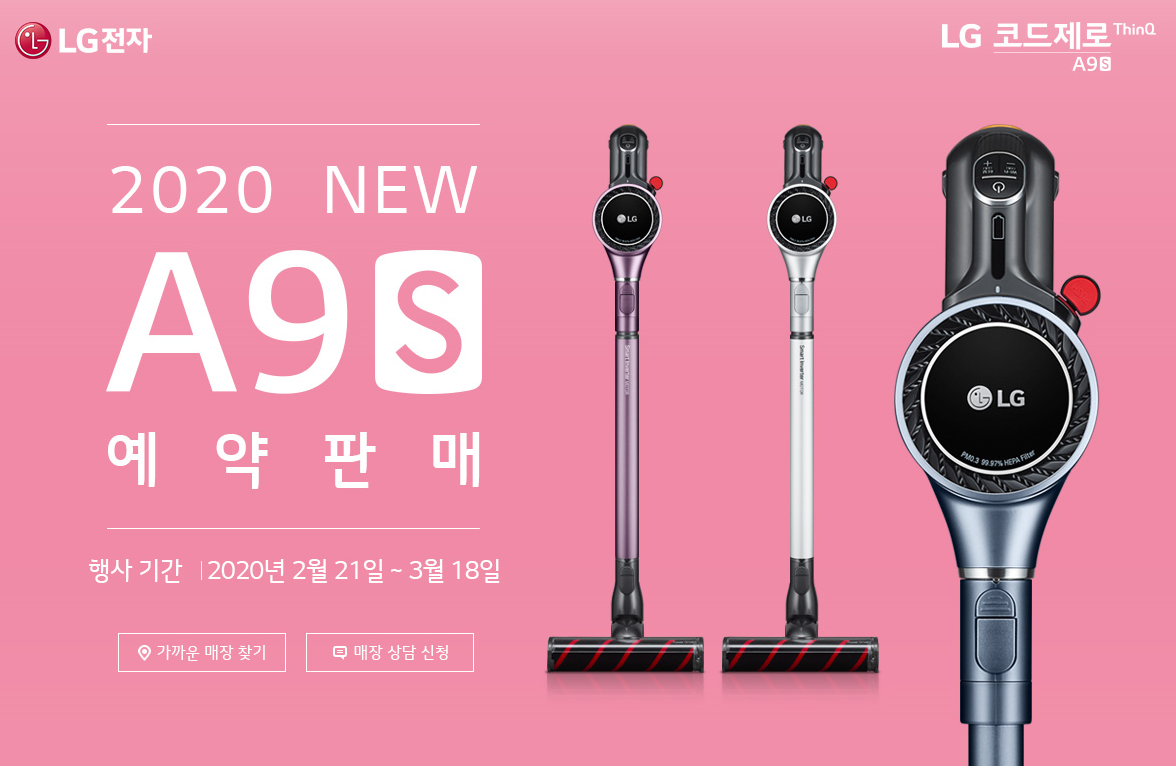 먼지와 물걸레 청소 두가지를 동시에 할 수 있는 장점으로도 부족해 이전 A9 기능을 업그레이하여 더욱 편리하고 깨끗하게 사용 가능한 2020 NEW LG 코드제로 A9S. 사전판매를 통해 선 구입하면 풍성한 추가 선물도 받을 수 있으니 무선청소기를 고민하고 계셨던 분들이라면 서둘러 가까운 LG매장에서 사전예판에 참여 풍성한 선물과 캐시백 행운까지 모두 잡아보시기 바랍니다.
