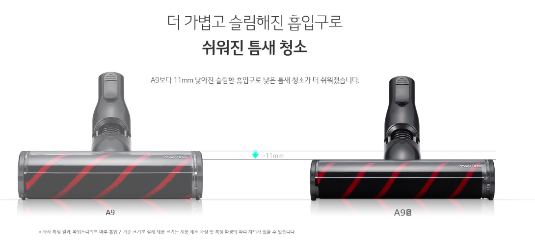 먼저 A9 기존제품과 비교해 보았을 때 더욱 슬림해진 파워드라이브 마루 흡입구가 눈길을 끌고 있습니다. A9S의 경우 A9보다 20% 슬림해진 마루흡입구를 자랑하는데요, 소파 밑이나 침대 밑 공간등 협소한 공간을 더욱 편리하게 청소할 수 있도록 구성되었습니다.