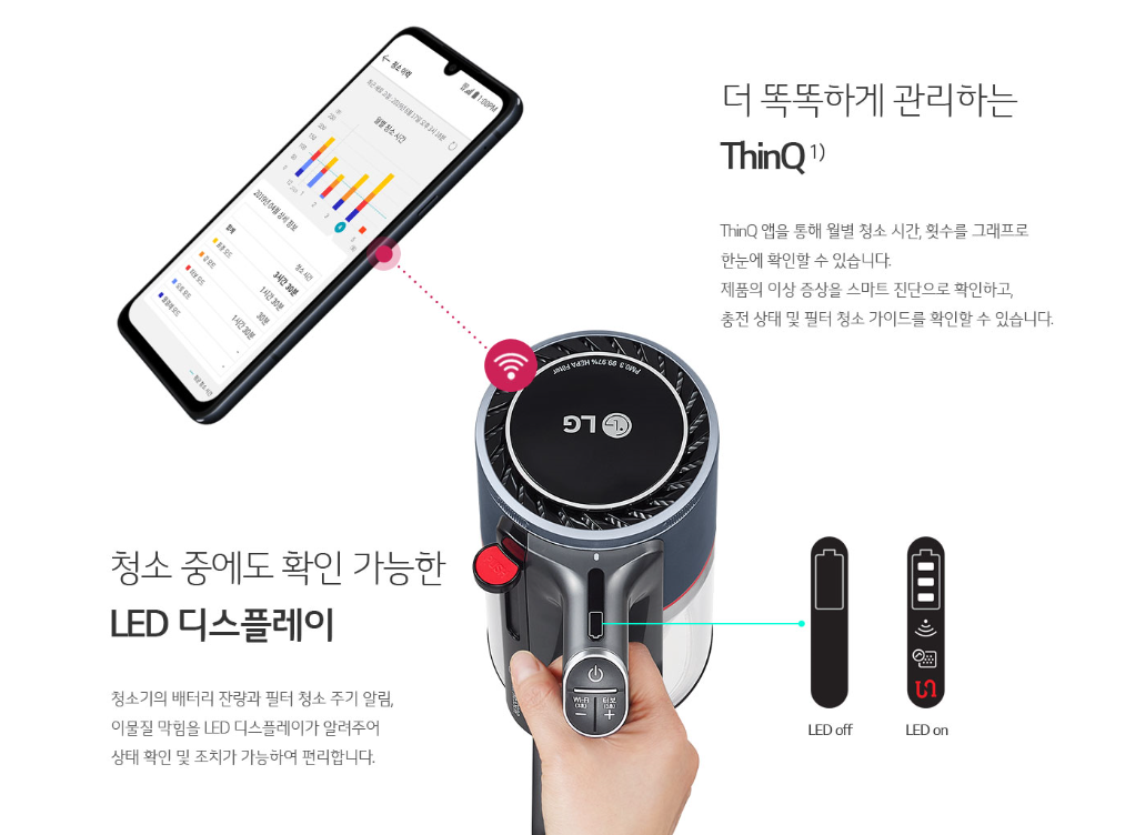 기존 성능을 업그레이드 한 부분 외에도 새롭게 추가된 부분도 있습니다. LED 디스플레이 부분에 있어 사용중인 배터리 잔량 확인이 가능하고, 이물막힘이라던가 와이파이 연결상태, 필터 청소 알림등 한 눈에 확인 가능하도록 구성되었습니다. 또한 씽큐 어플리케이션을 연동하면 사용 패턴 기록을 통한 청소 이력관리와 스마트 진단이 가능해 유용합니다.