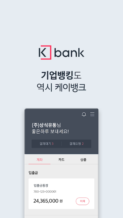 케이뱅크 기업뱅킹 다운로드 (안드로이드앱) : https://play.google.com/store/apps/details?id=com.kbankwith.cbzbank