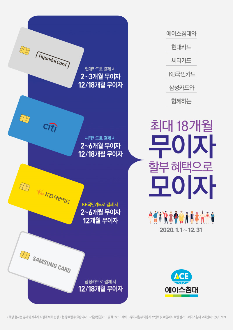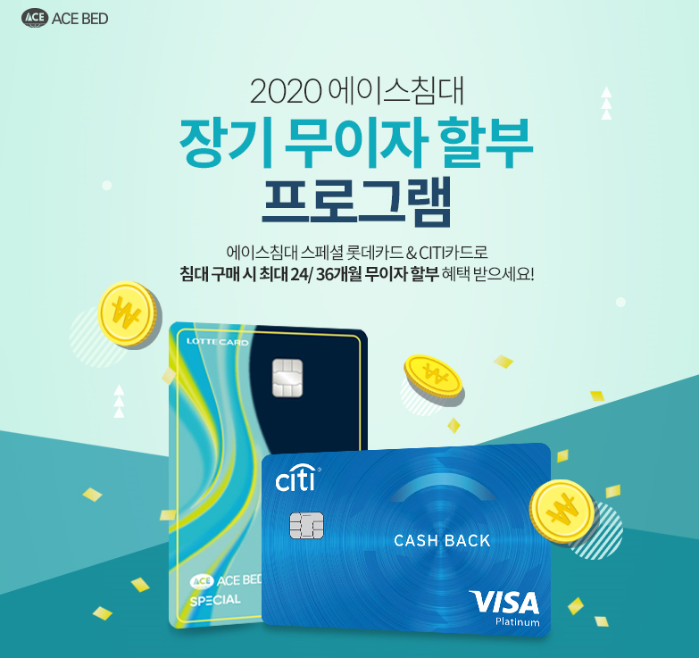 숙면을 위한 편안한 잠자리가 필요하다는 점은 누구나 알고 있지만, 쉽게 결정하지 못하는 부분 바로 비용입니다. 에이스침대는 프로모션을 통해 보다 합리적인 조건으로 구매가 가능한데요, 오는 6월 30일까지 에이스침대 스페셜 롯데카드로 결제할 경우 24/36개월 무이자 할부가 진행되고, 씨티카드로 결제하면 24개월 무이자 할부가 진행됩니다.