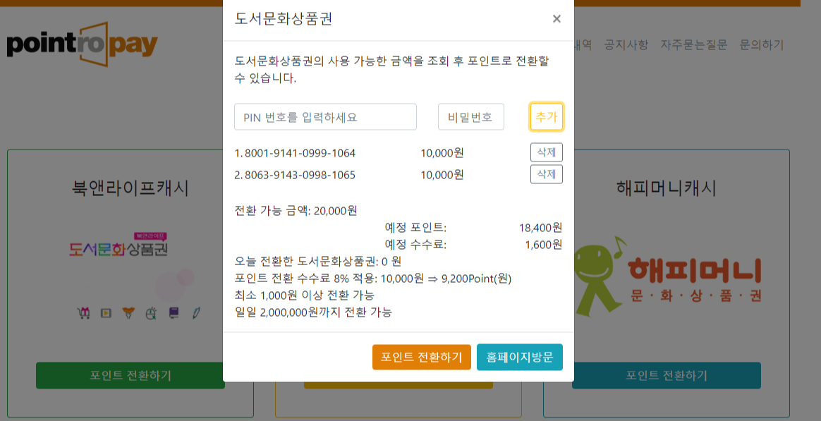 보유하고 있는 도서문화상품권이 있어 핀번호를 입력해 진행해보았습니다. 별도의 복잡한 절차 없이 핀번호를 입력하면 바로 전환 가능금액을 확인할 수 있고, 예정 포인트와 수수료를 한눈에 확인할 수 있어 진행이 간편합니다.