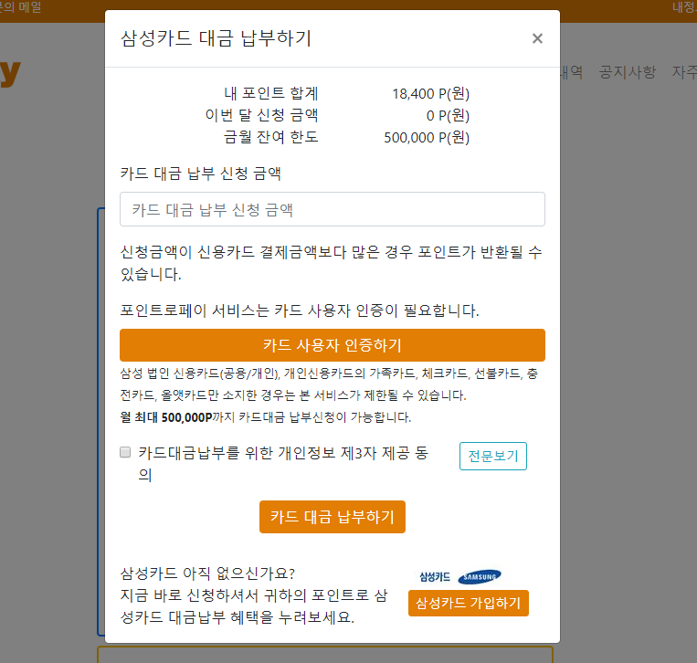 삼성카드 대금 납부하기 버튼을 누르면 현재 포인트로페이를 통해 사용 가능한 포인트 합계를 확인하고 카드 대금 납부 신청을 얼마나 할 것인지 입력하여 진행 가능합니다. 삼성카드의 경우 월 최대 500,000P 까지만 카드대금 납부진행이 가능하다는 점 잊지마시구요!
