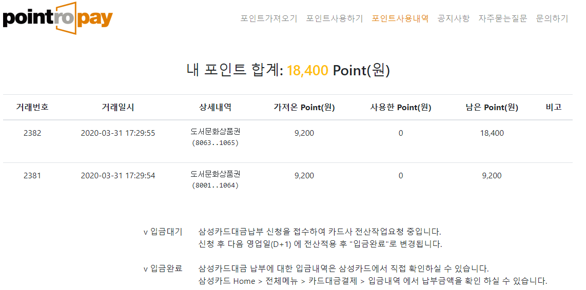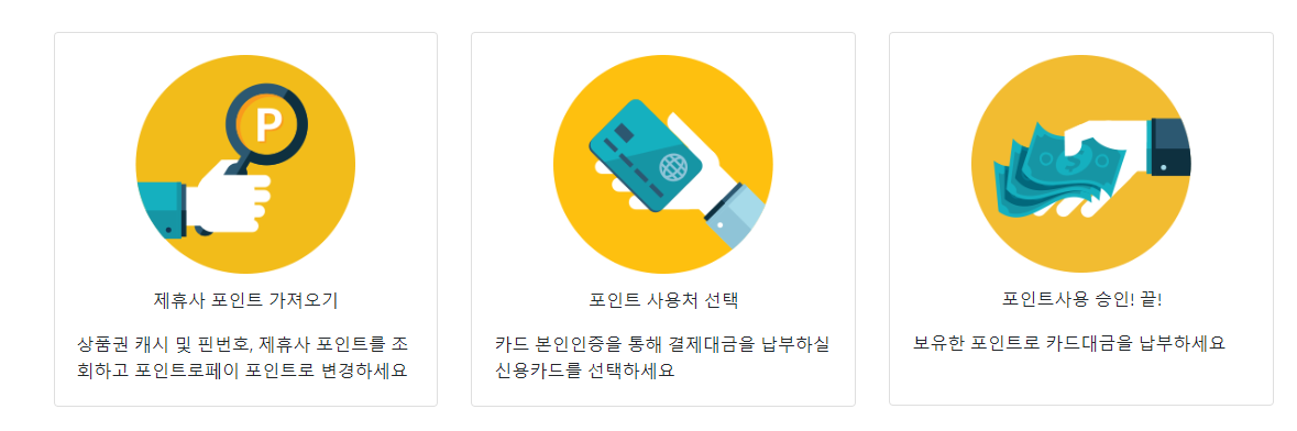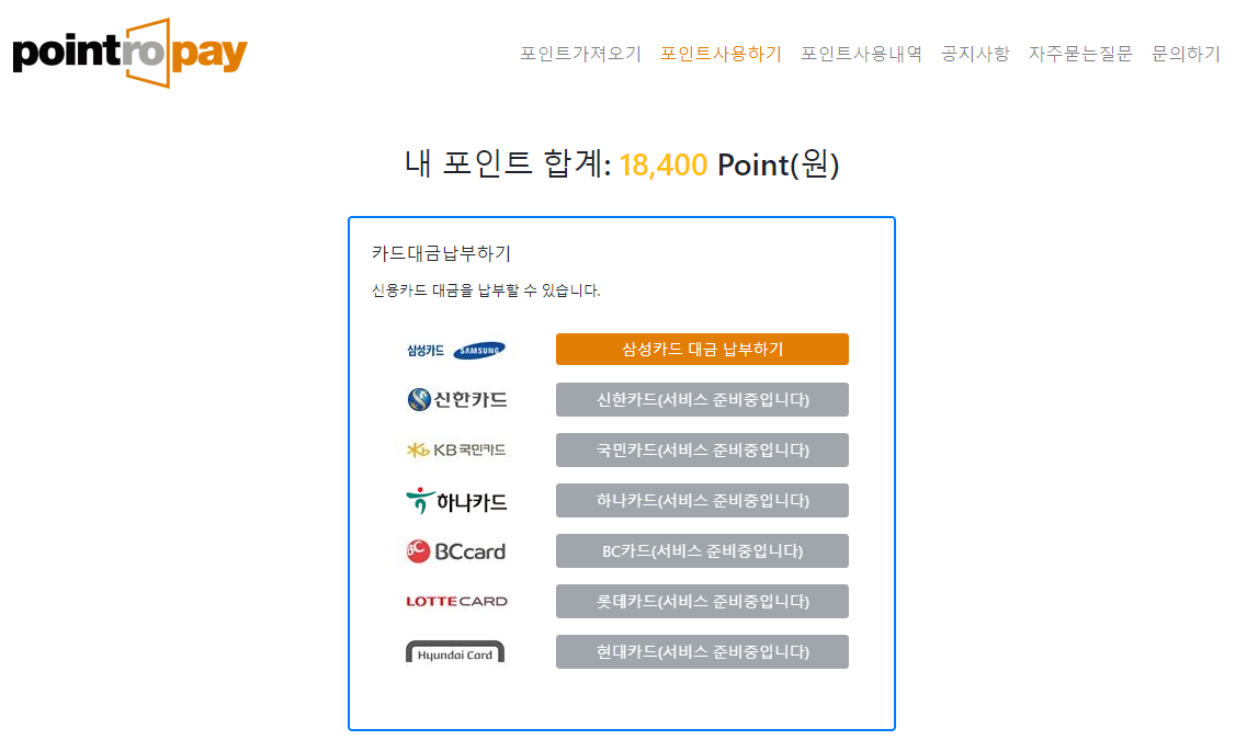 포인트로페이를 통해 적립된 포인트는 카드대금 납부에 활용 가능합니다. 현재 서비스 진행 가능한 카드는 삼성카드인데요, 추후 신한카드부터 국민카드, 하나카드, 비씨카드 등 서비스를 준비중이라고 하니 확인하시고 진행하시면 좋을 것 같습니다.