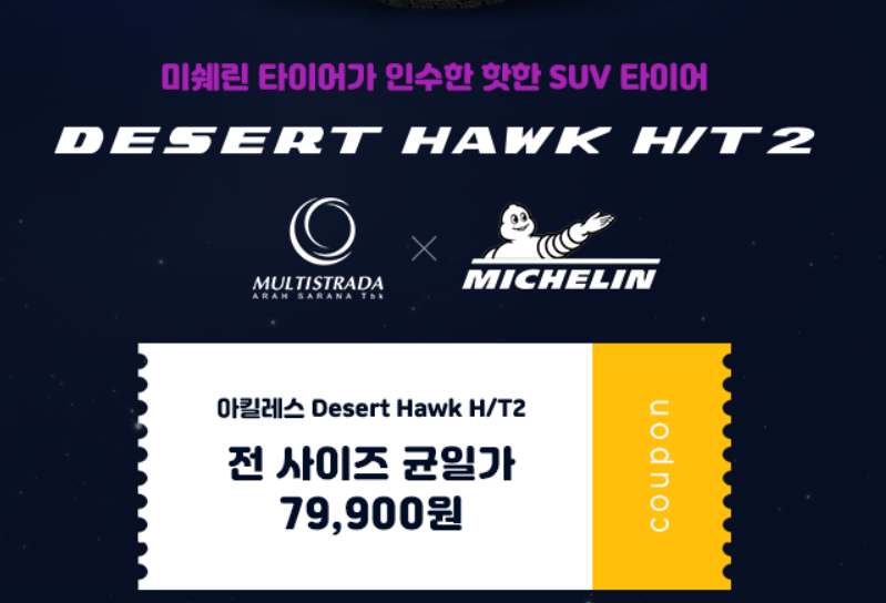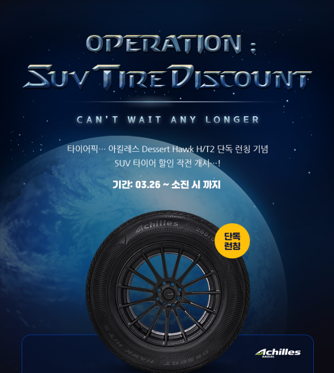 타이어픽에서 진행되는 아킬레스 타이어핫딜 이벤트는 3월 26일부터 시작되어 제품 소진시까지 진행된다고 합니다. 이번 이벤트는 아킬레스 Dessert HawK H/T2 단독 런칭 기념으로 진행되어서인지 할인혜택의 폭이 상당히 크게 느껴졌습니다.