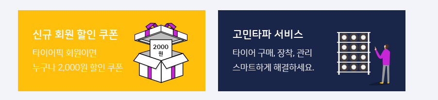 타이어픽 회원이 아니시라면 지금 신규가입을 통해 추가 할인쿠폰을 받을 수 있는데요, 현재 진행 중인 이벤트와 중복으로 사용 가능합니다. 또한 타이어 장착과 배송비 무료는 기본 30일 무상교환 서비스와 각종 정비 할인 제공까지 주어져 별다른 번러고움 없이 타이어 교체가 가능합니다.