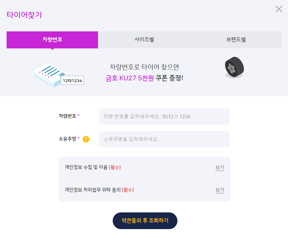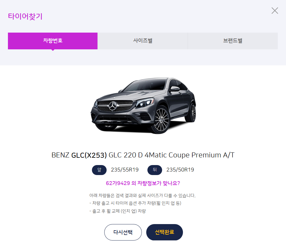소셜계정일 이용해 간단하게 회원가입을 하면 차량번호, 사이즈별 그리고 브랜드별 선택 가능한 타이어를 확인할 수 있습니다. 아무래도 타이어 선택시 여러가지 조건을 맞춰 고민하게 되는데요, 차량번호를 입력하면 차량 출고시 장착한 타이어를 확인할 수 있고, 그에 맞는 제품을 확인할 수 있어 유용합니다.