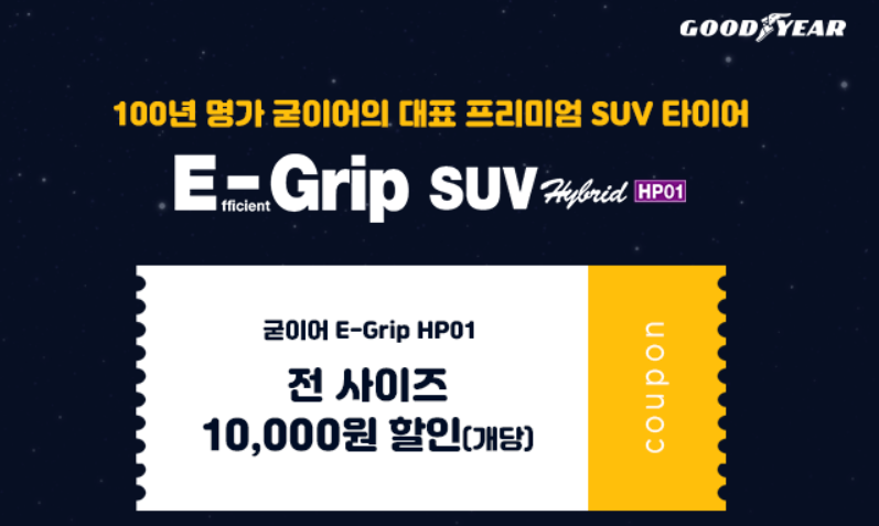 아킬레스 타이어 뿐만 아니라 굳이어 타이어 역시 개당 1만원의 할인쿠폰을 제공하고 있어 할인된 비용으로 구매 가능합니다. 굳이어 하면 100년의 타이어 역사를 가진 세계 빅3 타이어 제조 브랜드라는 점은 대부분 알고 계실텐데요, 타이어픽에서 쿠폰을 이용하면 보다 저렴하게 구매할수 있어 이번 이벤트를 놓치기엔 무척이나 아쉬울것 같습니다.