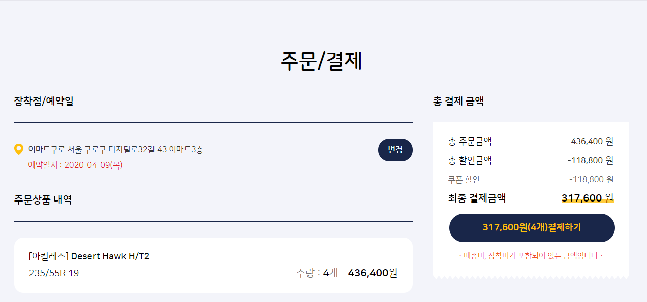 아킬레스 타이어 제품으로 4짝을 모두 선택한후 비용을 확인해보니, 쿠폰 할인가와 신규회원 할인혜택까지 더해져 할인 받는 비용이 상당했습니다. 특히 장착비용까지 포함한 가격이라는 점을 감안하면 어느 곳에서도 이 비용으로 4짝을 모두 바꿀 수 있을까 싶은 생각이 들더군요.