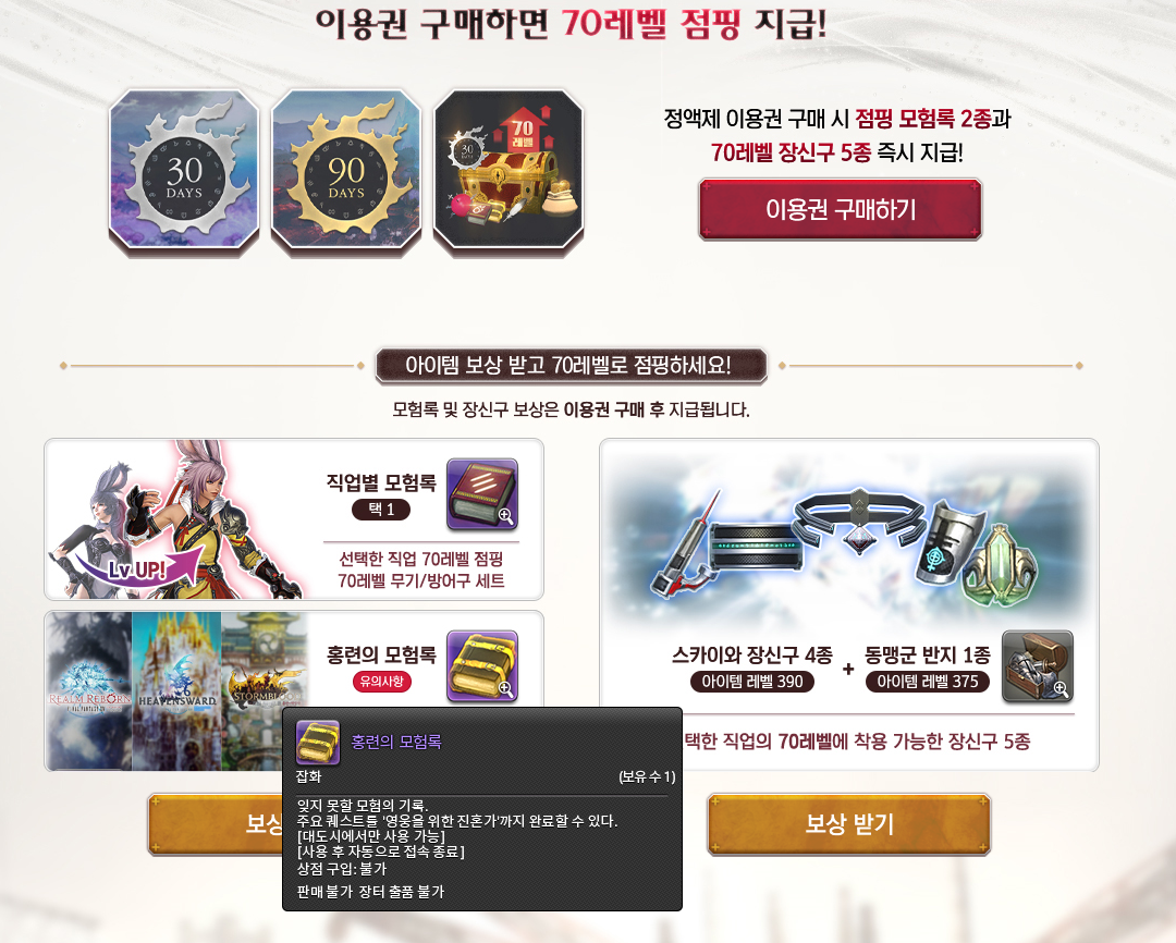 무엇보다 신규 가입과 함께 이용권을 구매할 경우 70레벨 점핑 지급이 주어디는데요, 점핑 모험록 2종과 70레벨 장신구 5종을 즉시 받을 수 있습니다. 이후 75레벨을 달성하면 무기와 장신구가 추가로 주어지는데요, 그동안 파판14 플레이를 망설였던 분들이라면 지금이 딱 시작할 적기인것 같습니다. 우선 무료로 주어지는 7일을 플레이 해보고 과금을 결정해도 충분하니 말이죠.