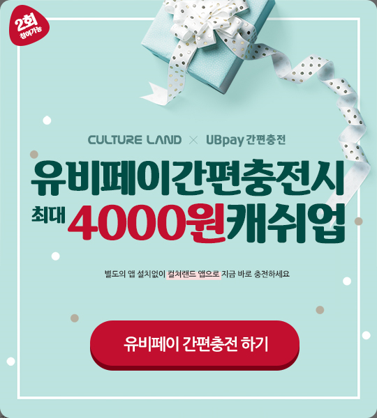 유비페이간편충전 혜택도 준비되어 있습니다. 유피페이를 이용한 간편 충전을 진행할경우 1만원 이상 충전시 2천원의 캐쉬업을 받을 수 있습니다. ID별로 2회 참여 가능해 최대 4천원의 캐쉬업을 받을 수 있는데요, 별도의 앱 설치없이 컬쳐랜드 앱으로 바로 충전 가능해 유용합니다.