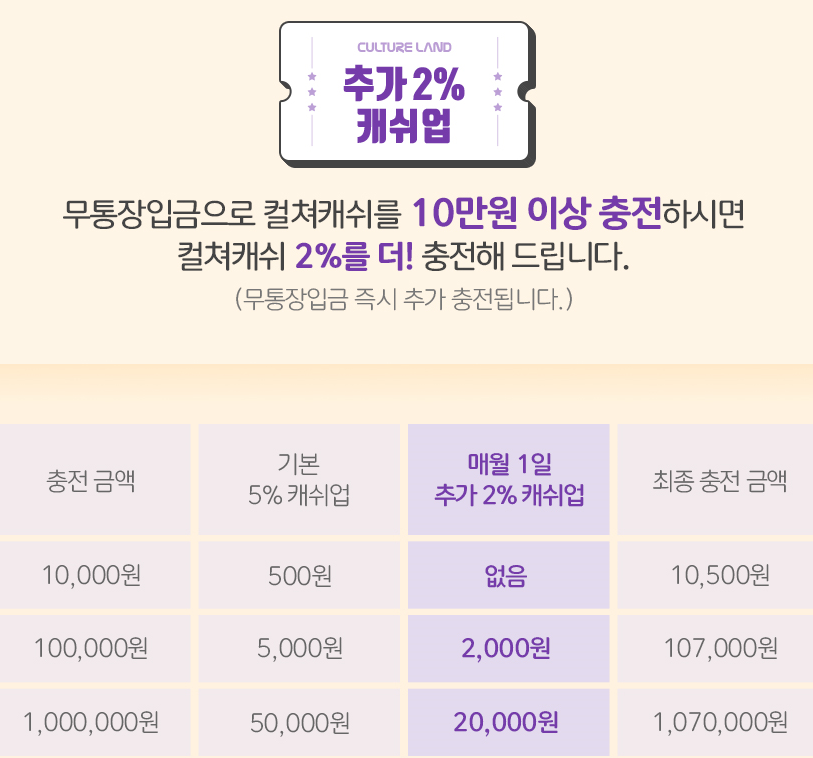 무통장입금을 통한 컬쳐캐쉬 충전 금액에 따른 캐쉬업 비용을 확인해 보면 기본 5%에 대한 비용은 기본으로 적용되는데요, 매월 1일 10만원 이상 충전을 진행하면 컬쳐캐쉬 2%를 더 충전받을 수 있어 최종 충전금액이 당초 진행했던 금액보다 늘어나 더욱 많은 캐쉬업을 받을 수 있게 됩니다.