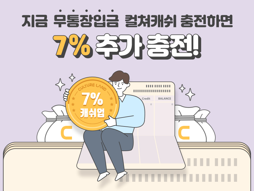 컬쳐캐쉬를 충전은 문화상품권 뿐만 아니라 무통장입금으로도 가능합니다. 특히 무통장입금을 통해 컬쳐캐쉬를 충전하면 기본 5%의 캐쉬업을 받을 수 있는데요, 매월 1일에는 2%에 해당하는 추가 캐쉬업이 추가로 주어져 받을 수 있는 캐쉬업 금액이 늘어나게 됩니다.