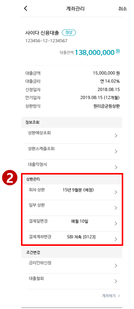 대출을 받은 후 상환과 결제진행에 있어 변경에 도움을 주는 서비스도 제공됩니다. 회사 상환을 통해 이번 회차 대출금을 선납할 수 있고, 일부 상환을 통해 다음 회차 선납도 가능합니다. 뿐만 아니라 결제일을 변경하거나 결제계좌 변경이 필요할 경우 별도의 지점 방문 없이 간편하게 진행 가능합니다.