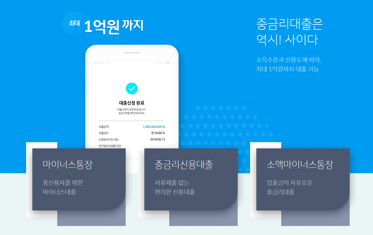 SBI저축은행 사이다뱅크에서 받을 수 있는 대출도 최대 1억까지 받을 수 있는 장점을 가지고 있습니다. 중신용자를 위한 직장인을 대상으로한 중금리신용대출 & 서비스는 서류 제출없이 편리한 방법으로 대출을 신청할 수 있어 시간을 절약할 수 있는 장점도 가지고 있습니다.