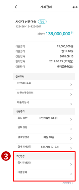 대출 조건 변경 서비스도 제공됩니다. 신용등급이 향상되거나 부채감소에 따른 금리 인하신청이 가능한데요, 직장변경이라던가 소득증가에 따른 금리인하 신청 서비스도 지점 방문없이 SBI저축은행 사이다뱅크 앱하나로 설정 및 처리가 가능합니다.