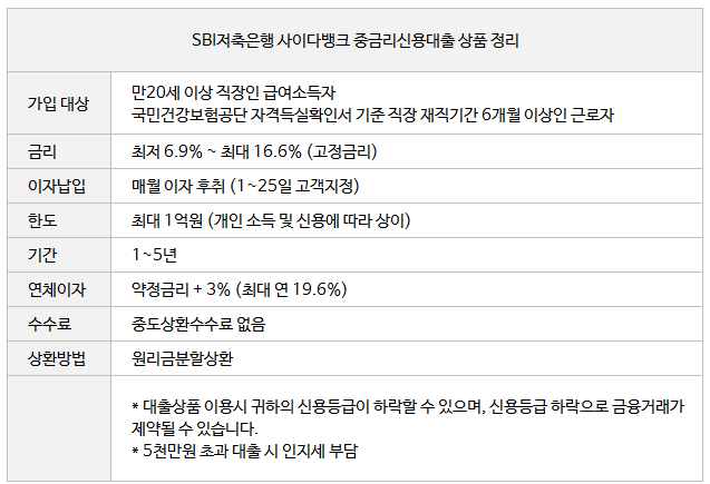 SBI저축은행 사이다뱅크 중금리신용대출 & 서비스는 6개월 이상 건강보험 직장인 가입자라면 누구나 이용 가능합니다. 또한 금리에 있어서도 저축은행 중금리 신용대출 금리가 최저 연 5.8%~ 최고 연 19.9%인 반면 사이다뱅크 중금리 신용대출은 최저 6.9% ~ 최고 연 16.6%를 적용하여 보다 합리적입니다.