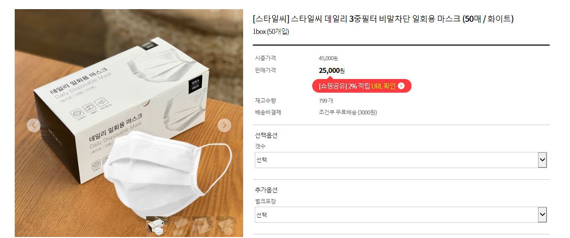 특히 코로나 여파로 인해 마스크 착용이 의무화된 지금 가장 많이 사용하는 일회용 마스크도 스타일씨에 준비되어 있어 별다른 어려움 없이 구매 할 수 있습니다. 많은 분들이 먼저 사용해보고 후기로 인증한 만큼 일회용 마스크 구매가 필요한 분들이라면 둘러보시는 것도 좋을 것 같습니다.