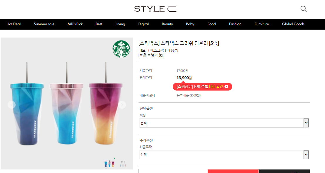 스타벅스 매장에서 구매해도 좋지만 가격대가 합리적인 가격으로 구매하길 원한다면 단연 스타일씨가 답이 될 수 있는데요, 현재 스타벅스 크러쉬 텀블러 5종을 합리적인 비용으로 구매할 수 있습니다. 이외에도 다양한 제품이 구성되어 있는데요, 샤오미 전제품 무료배송도 진행되고 있어 유용합니다.