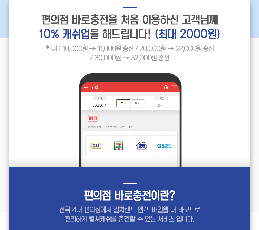 편의점 바로 충전은 전국 4대 편의점에서 컬쳐랜드 앱이나 모바일웹 바코드를 이용한 컬쳐캐쉬 충전 방법입니다. 소액충전이 필요한 경우 가까운 편의점에서 충전하고 10% 캐쉬업을 받을 수 있는데요, 최대 2,000원의 캐쉬업을 받을 수 있습니다.