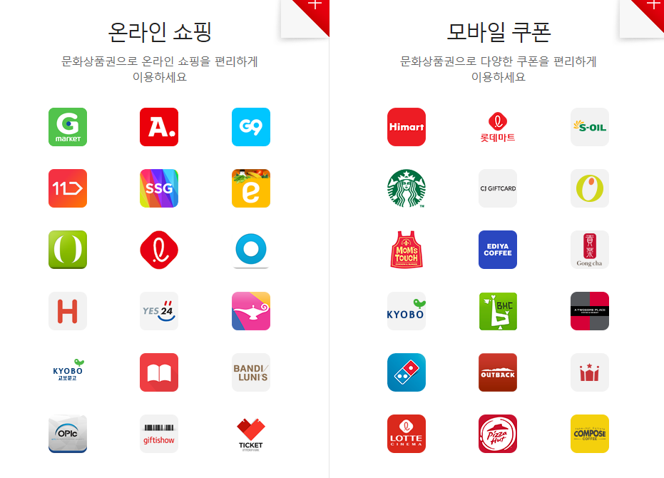 컬쳐캐쉬 사용처는 온라인 쇼핑과 모바일쿠폰 구매로 크게 나눌 수 있습니다. 사용처를 보면 많은 분들이 이용하는 온라인 쇼핑몰과 오프라인 매장들이 눈에 띄는데요, 이외에도 구글기프트카드 구매를 통해 필요한 아이템을 구매할 수 있어 사용처에 대한 걱정은 신경쓰지 않아도 될 정도입니다.
