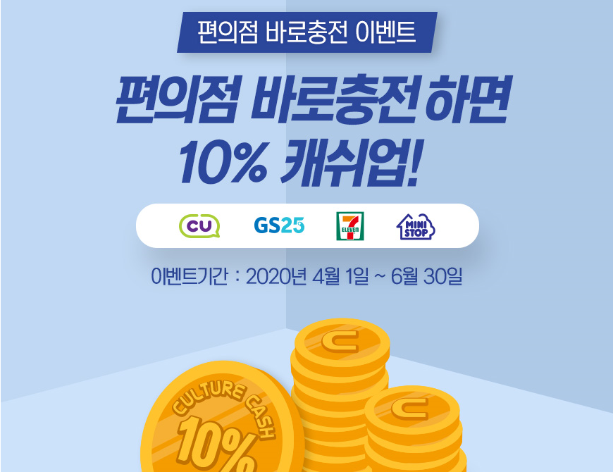무통장입금에 따른 캐쉬업 이벤트 외에도 편의점 바로 충전을 이용하면 가능한 10% 캐쉬업 이벤트도 진행 중에 있어 가까운 편의점을 통해 바로충전하고, 캐쉬업 10% 혜택도 챙길 수 있습니다.