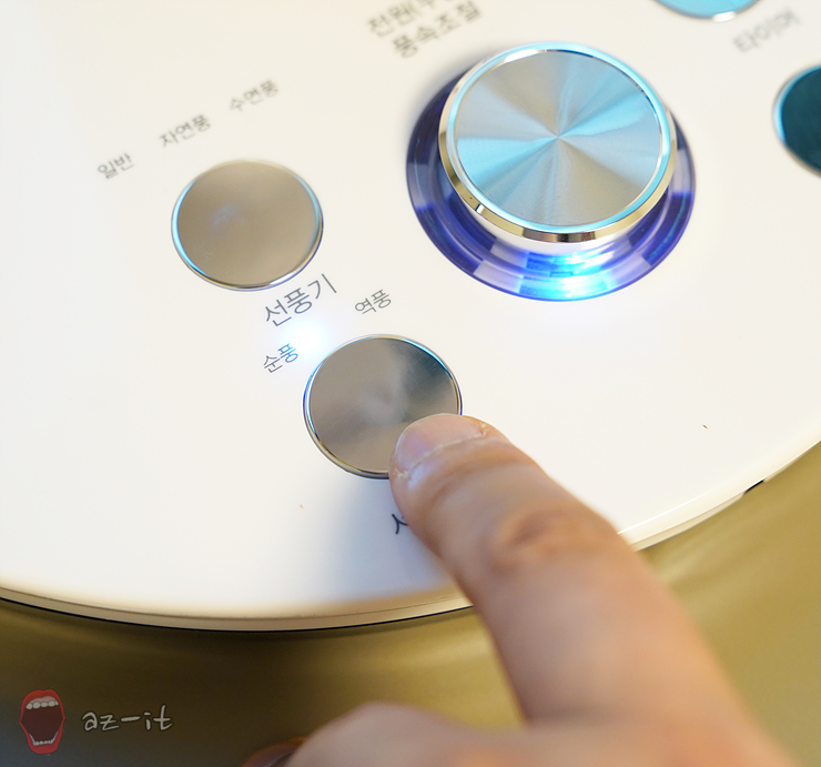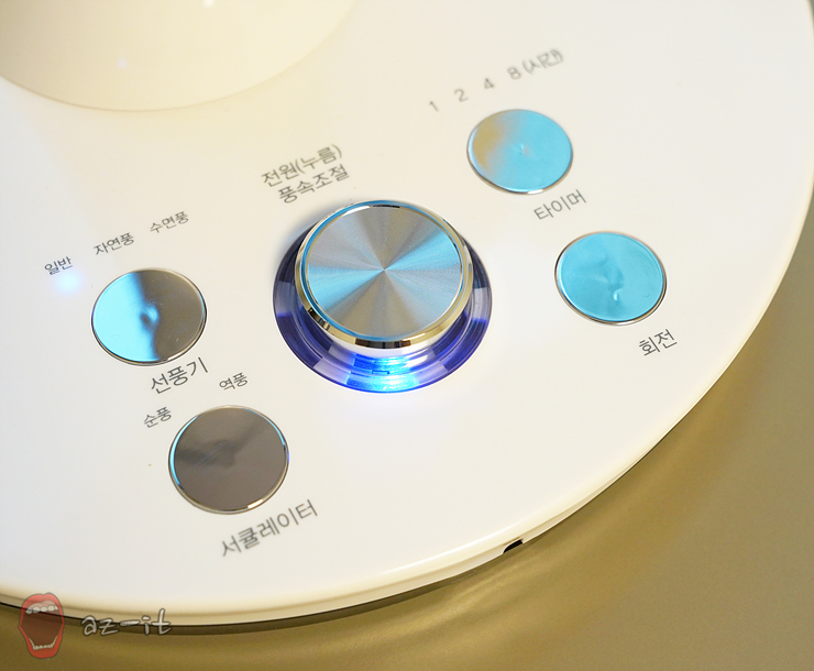 선풍기와 서큘레이터 두 가지 기능을 모두 갖추고 있는 장점외에도 풍속을 1단계~12단계 원하는 선택이 가능한 점도 좋지만 타이머 설정 역시 1시간~15시간까지 원하는 시간으로 설정 가능해 편리합니다. 여기에 다이얼을 눌러주면 전원이 ON/OFF 되면서 블루 LED 불빛이 새어나와 늦은 밤 불을 따로 켜지 않아도 조작이 편리합니다