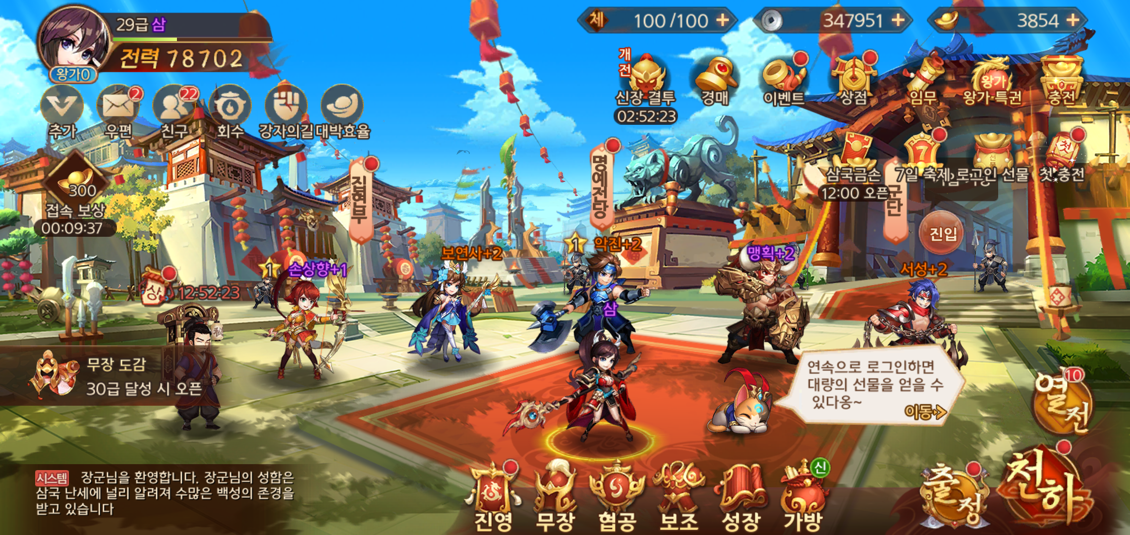 무장들은 협공을 통한 공격적인 스킬을 발휘할 수도 있지만, 인연을 통한 능력치를 향상시킬 수도 있어 이를 활용하는 것이 중요합니다. 아무래도 초반에는 천하로 나아가 단계별 전투를 벌이면서 무장이나 필요한 아이템을 획득 기본 전투력을 높여주는 것이 무엇보다 중요한 부분이구요.