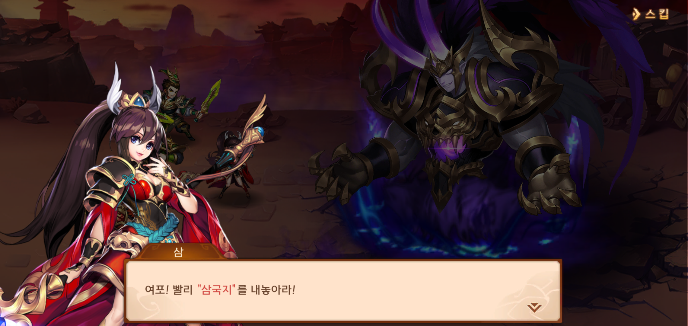그랑삼국은 단순히 삼국지게임의 특징이 아닌 스토리를 즐길 수 있도록 애니메이션기법이 도입되어 있다는 점인데요, 시작부터 진행된 마신 여포와의 대화는 한층 몰입도를 높여주기도 했습니다. 이후에도 계속되는 적과의 대화는 한층 강해져야겠다는 마음도 들게 만들고 말이죠.