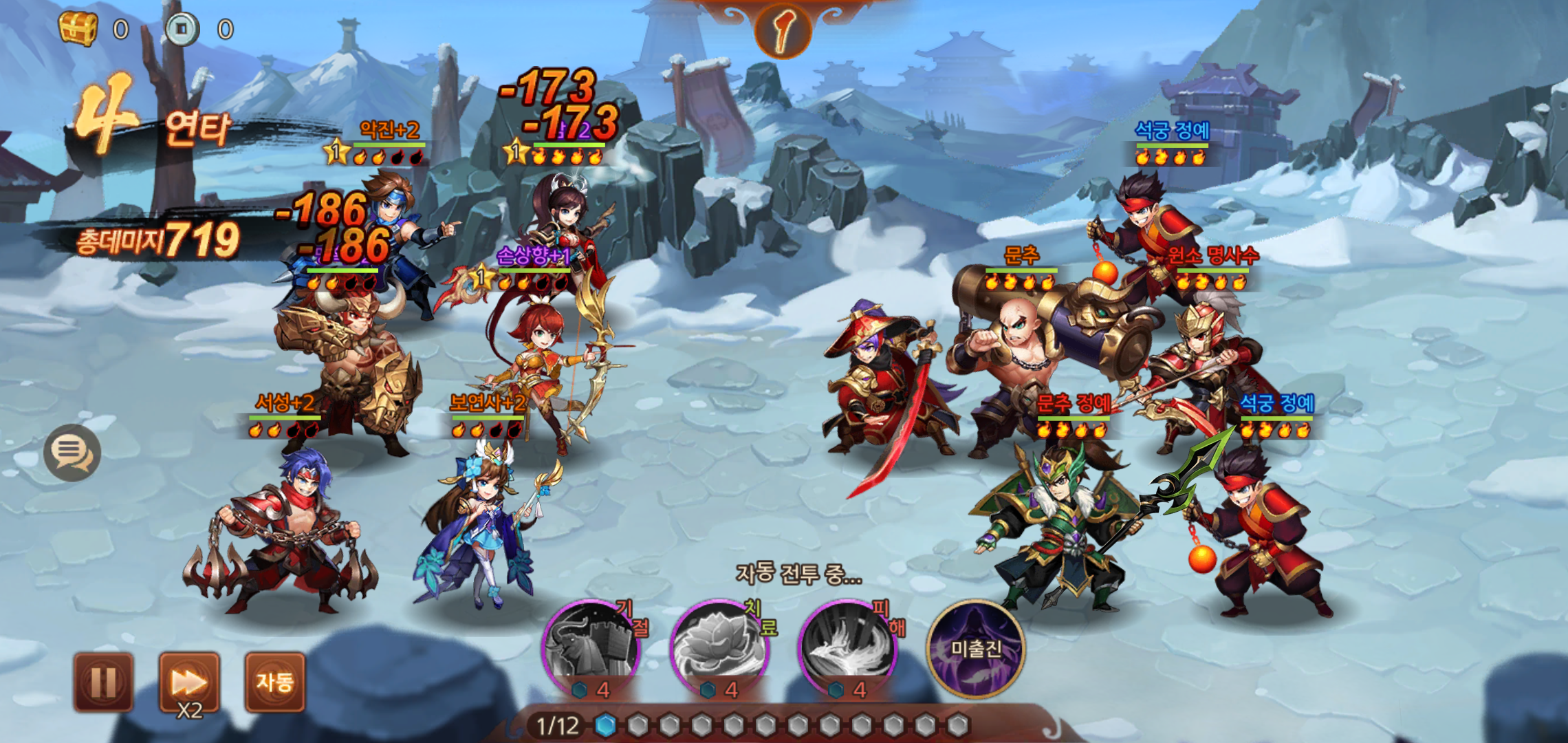 전투는 미리 설정한 진영에 따른 무장들과 적들과 승패를 가리는 방식으로 진행됩니다. 특히 협공스킬을 미리 설정해 두면 적재적소에 따라 사용할 수 있기 때문에 덱 구성시 협공스킬 배치라던가 협공가능한 무장들을 수집한 구성이 필수적입니다.